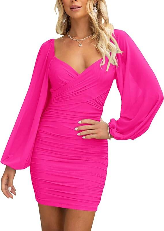 #7 BTFBM Women's Elegant Ruched Bodycon Dresses Summer Fall Mesh Long Sleeve Cross V Neck Party Club Cocktail Mini Dress-$46.99